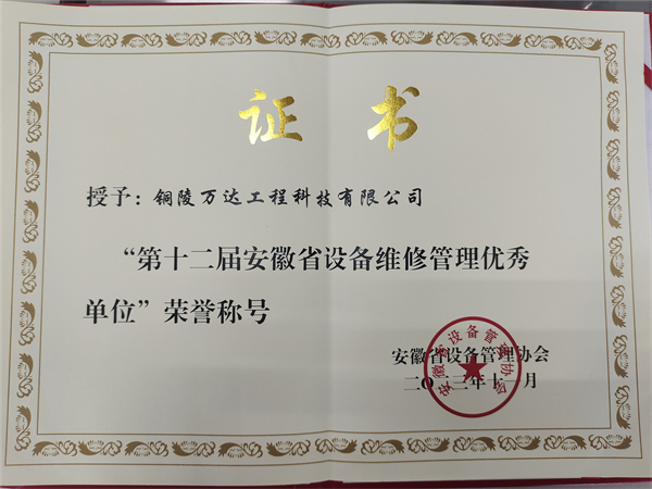 “第十二屆安徽省設備維修管理優秀單位”榮譽稱號